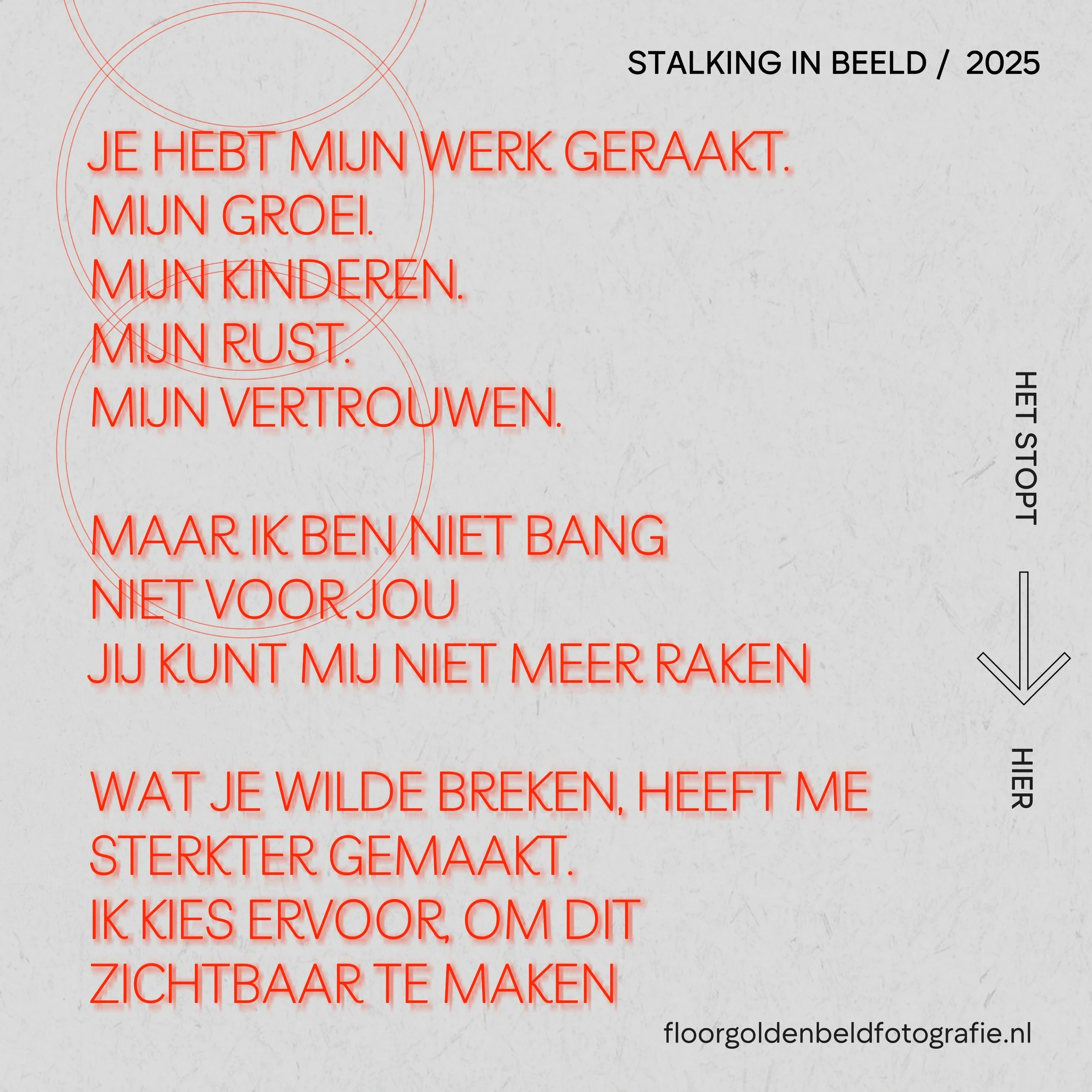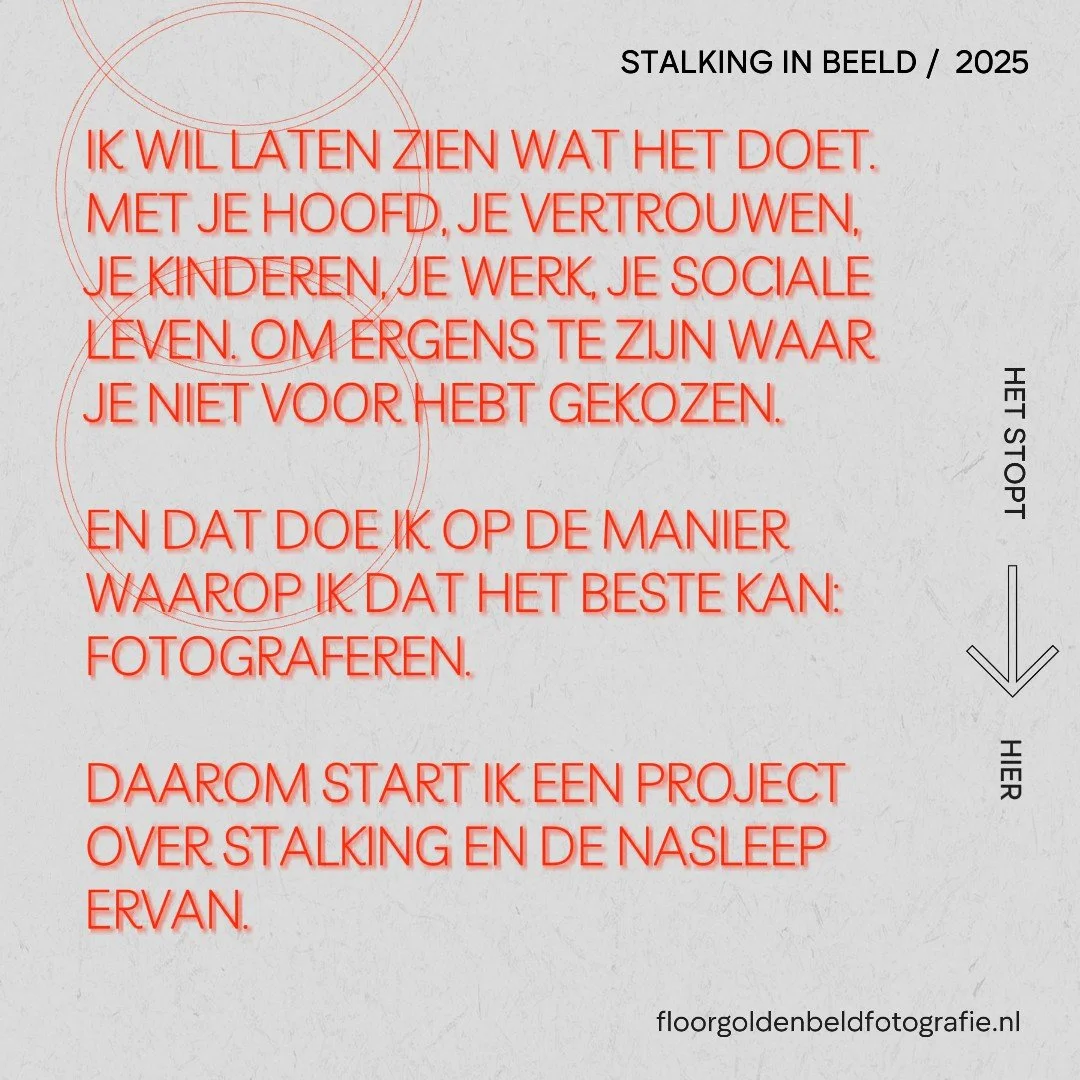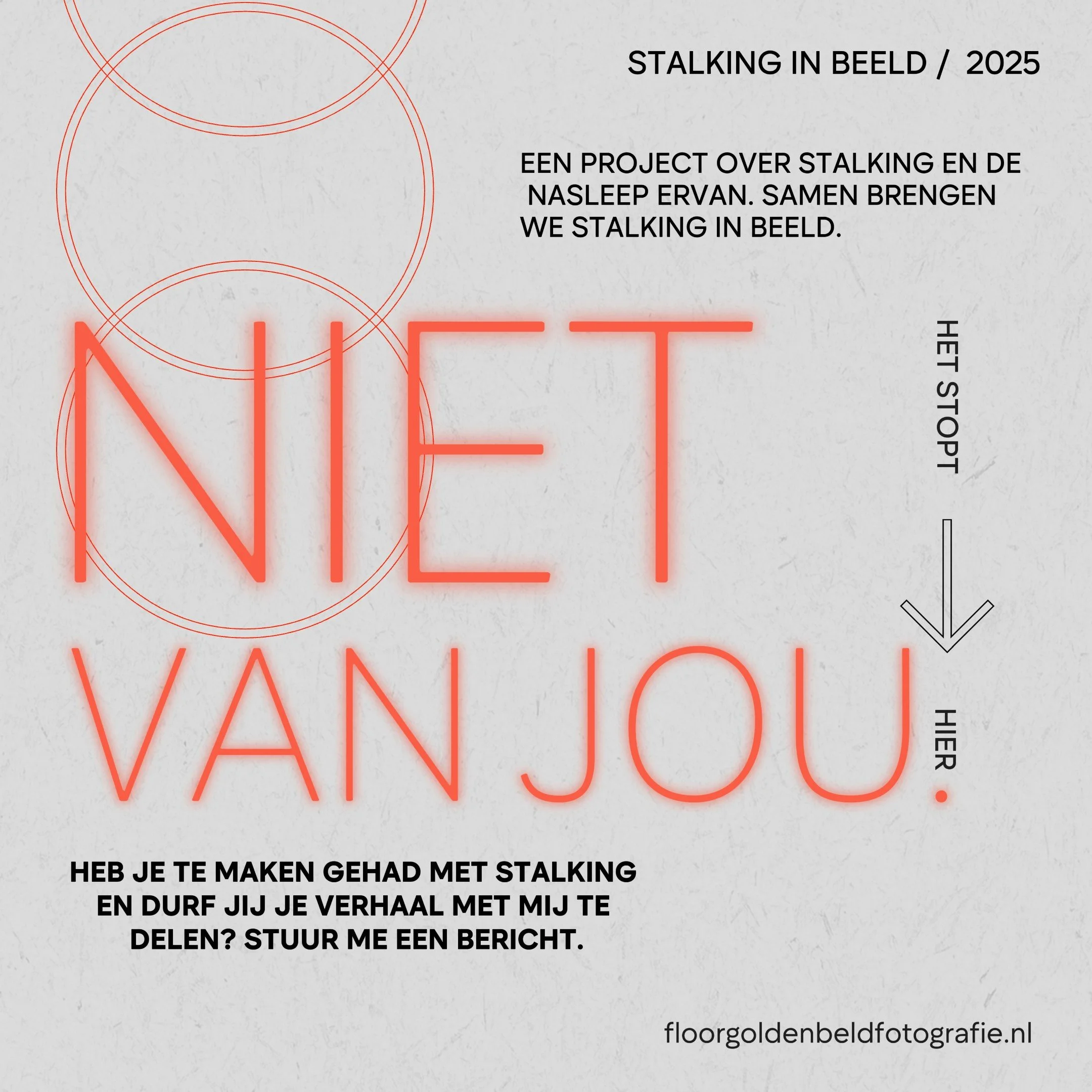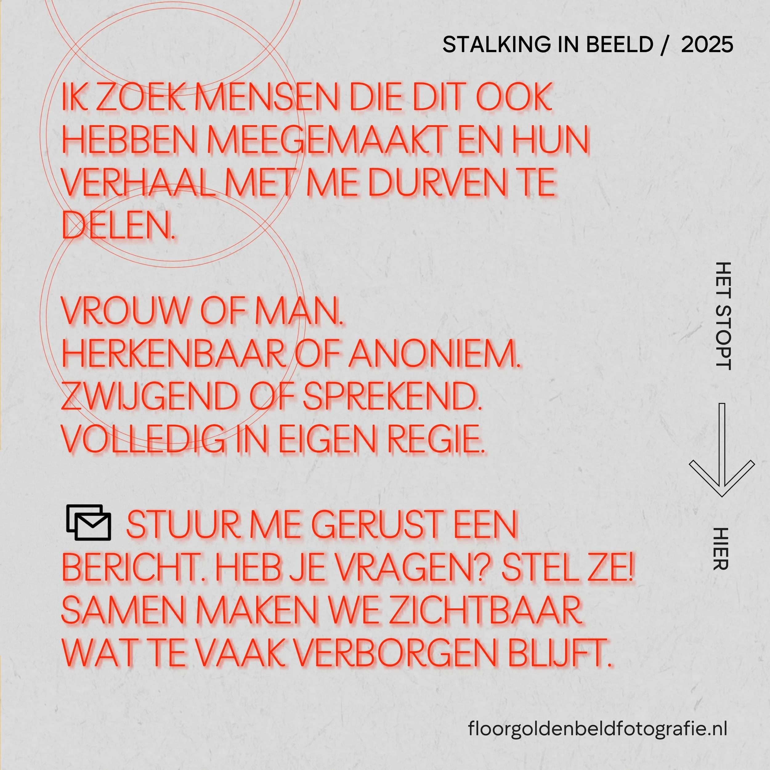 Daarom ben ik op zoek naar mensen die hun ervaring met stalking willen delen. Mensen die ik mag portretteren, man of vrouw, zichtbaar of anoniem, in hun eigen tempo. Om samen een project te maken dat raakt, verbindt en bewustwording brengt.